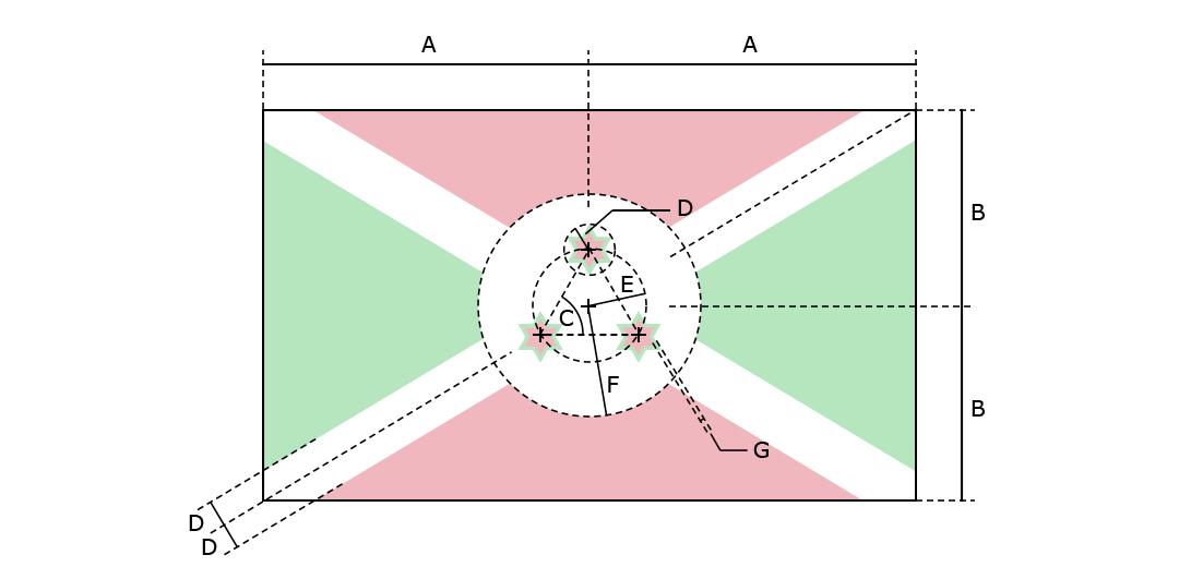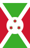 The flag of Burundi divided by a white diagonal cross into red panels (top and bottom) and green panels (hoist side and outer side) with a white disk superimposed at the center bearing three red six-pointed stars outlined in green arranged in a triangular design (one star above, two stars below). Red represents the struggle for independence. Green is for hope and white is for peace. The three stars symbolize the national motto - “ Unity, Work, Progress”.