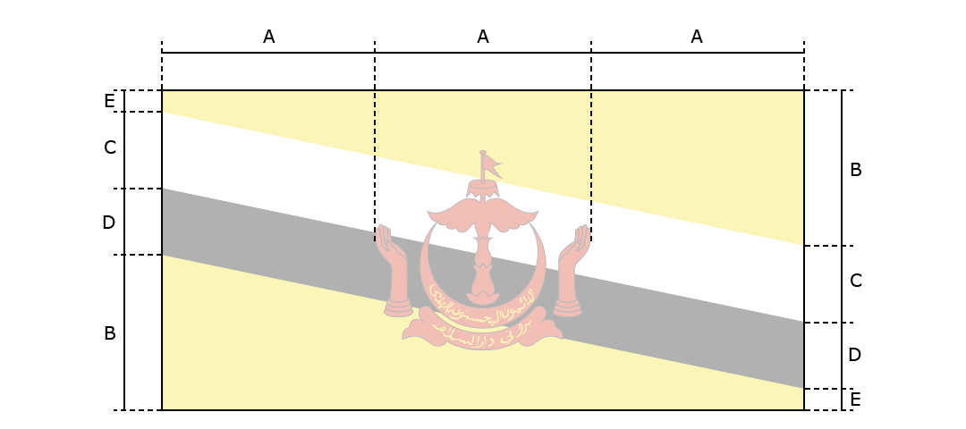 Yellow with two diagonal bands of white (top, almost double width) and black starting from the upper hoist side; the national emblem in red is superimposed at the center; the emblem includes a swallow-tailed flag on top of a winged column within an upturned crescent above a scroll and flanked by two upraised hands.