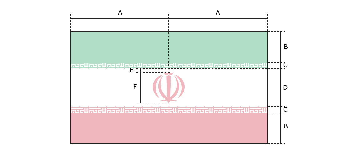 Three equal horizontal bands of green (top), white, and red; the national emblem (a stylized representation of the word Allah in the shape of a tulip, a symbol of martyrdom) in red is centered in the white band; ALLAH AKBAR (God is Great) in white Arabic script is repeated 11 times along the bottom edge of the green band and 11 times along the top edge of the red band.