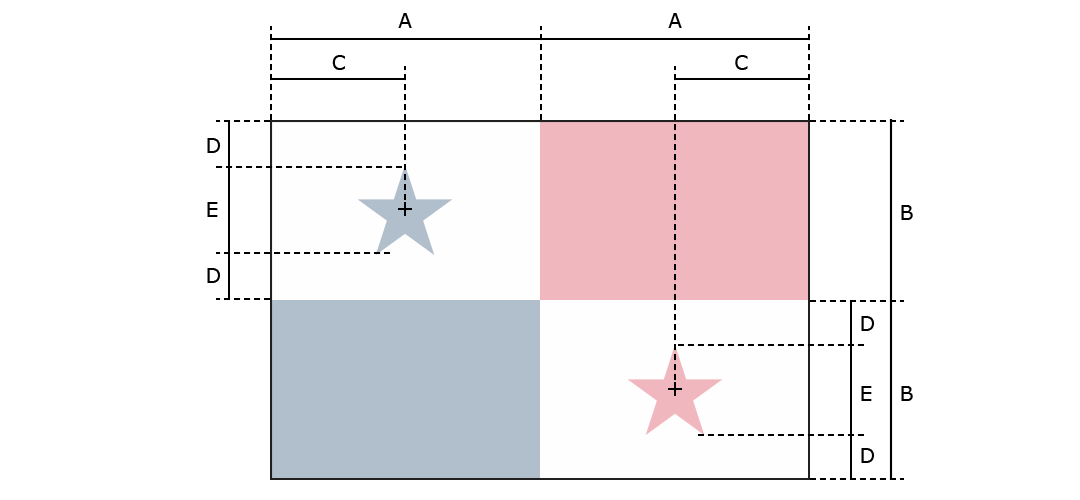 Divided into four, equal rectangles; the top quadrants are white (hoist side) with a blue five-pointed star in the center and plain red; the bottom quadrants are plain blue (hoist side) and white with a red five-pointed star in the center.