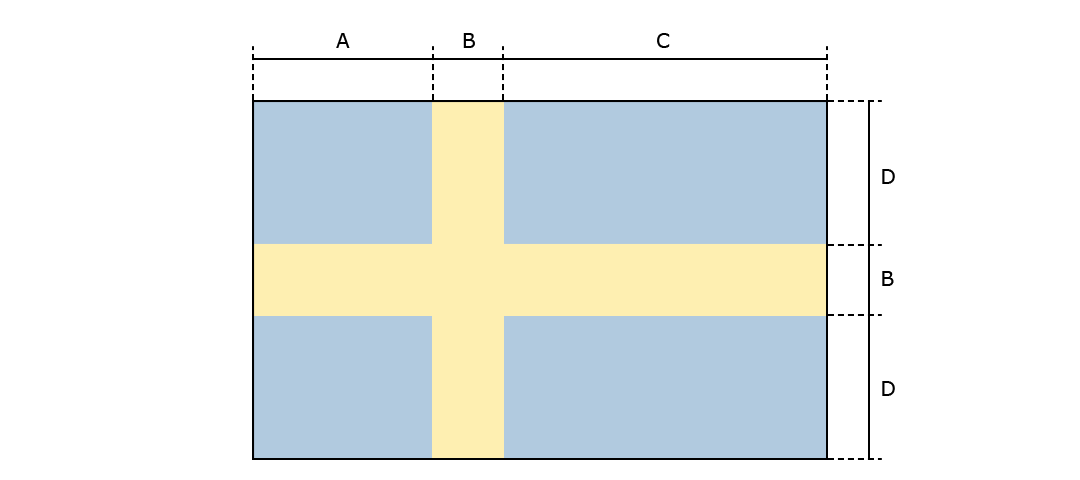 Blue with a golden yellow cross extending to the edges of the flag; the vertical part of the cross is shifted to the hoist side.