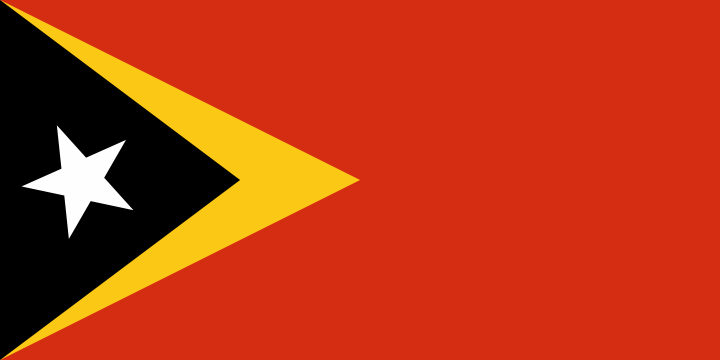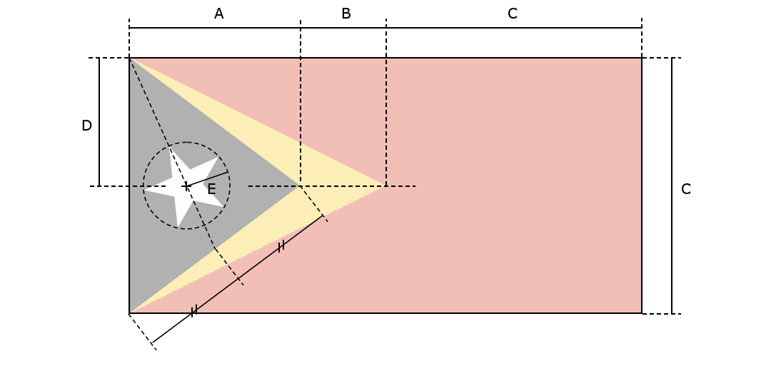 Red, with a black isosceles triangle (based on the hoist side) superimposed on a slightly longer yellow arrowhead that extends to the center of the flag; there is a white star in the center of the black triangle.