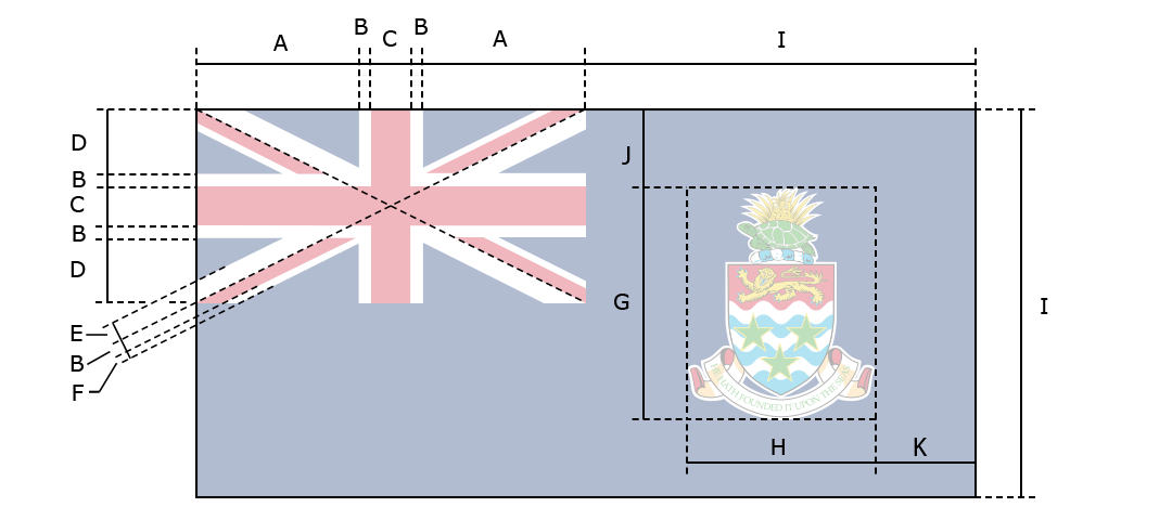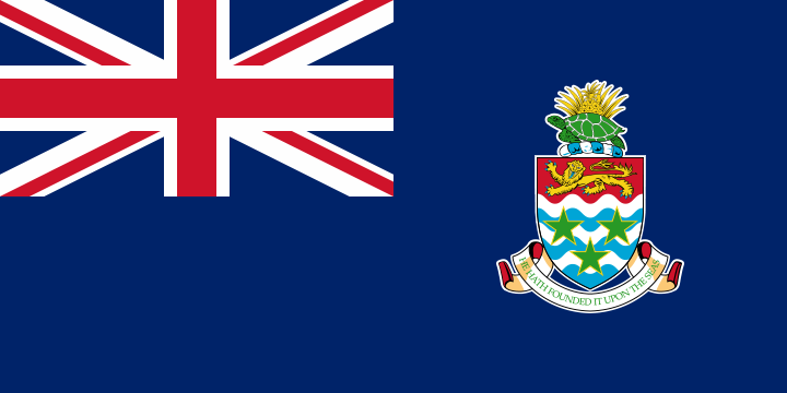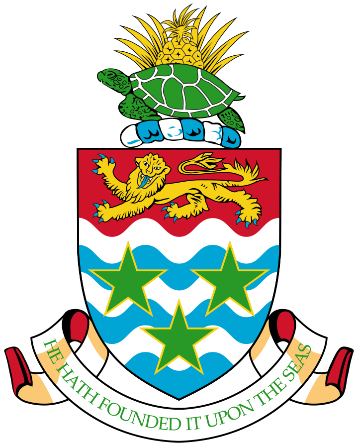 A blue field, with the flag of the UK in the upper hoist-side quadrant and the Caymanian coat of arms centered on the outer half of the flag; the coat of arms includes a crest with a pineapple, representing the connection with Jamaica, and a turtle, representing Cayman's seafaring tradition, above a shield bearing a golden lion, symbolizing Great Britain, below which are three green stars (representing the three islands) surmounting white and blue wavy lines representing the sea and a scroll at the bottom bearing the motto HE HATH FOUNDED IT UPON THE SEAS.