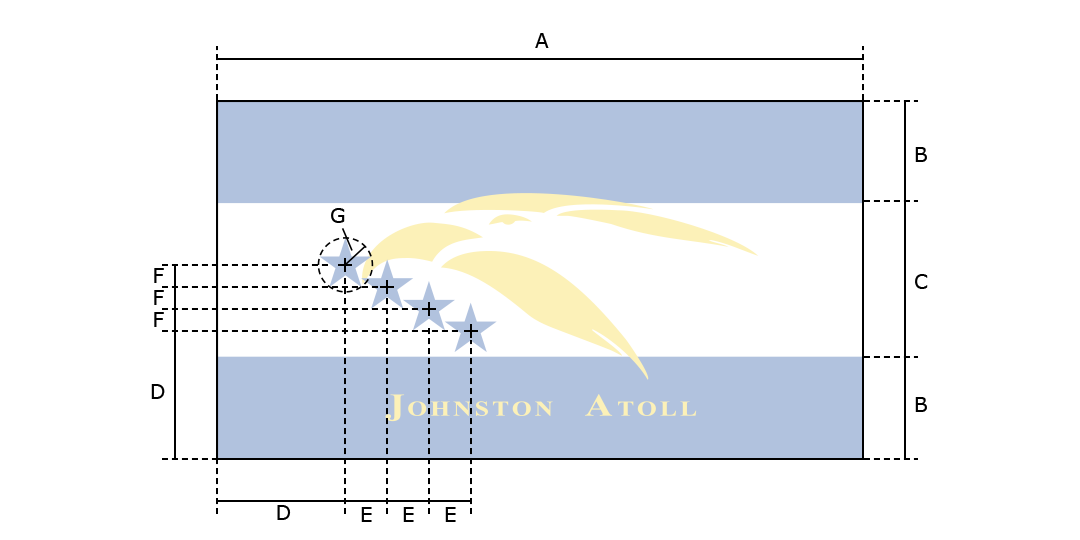 The unofficial flag consists of three horizontal stripes, the upper and lower stipes are blue and the middle stripe white.The color white symbolizes the coral, while the color blue refers to the surrounding ocean. Central on the flag are a bird and four stars. The bird represent the United States AirForce and the United States Fish and Wildlife Service, administrators of the territory. The four stars represent Johnston Island, Akau Island Hikina Island and Sand Island.