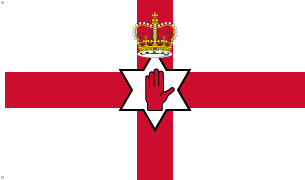 White rectangle, in its central portion a red cross connecting all four sides of the flag. With in the centre a Crown, the Star of David, and the Red Hand of Ulster.