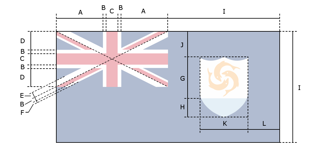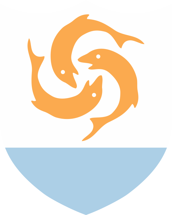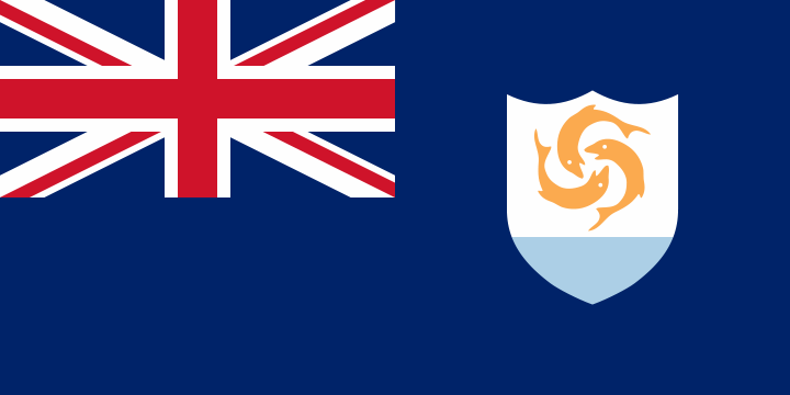 The flag of Anguilla is blue, with the flag of the UK in the upper hoist-side quadrant and the Anguillan coat of arms centered in the outer half of the flag; the coat of arms depicts three orange dolphins in an interlocking circular design on a white background with blue water below. The three dolphins stand for friendship, wisdom and strength.