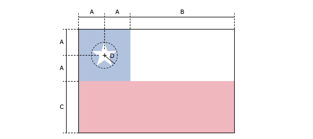 Two equal horizontal bands of white (top) and red; there is a blue square the same height as the white band at the hoist-side end of the white band; the square bears a white five-pointed star in the center representing a guide to progress and honor; blue symbolizes the sky, white is for the snow-covered Andes, and red stands for the blood spilled to achieve independence; design was influenced by the US flag.