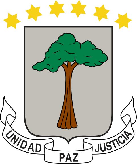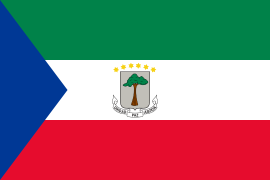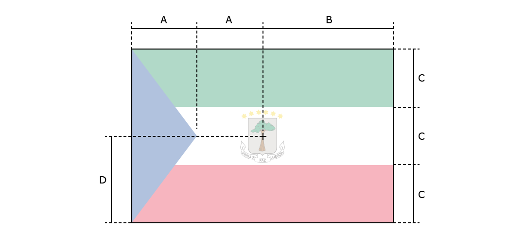 Three equal horizontal bands of green (top), white, and red with a blue isosceles triangle based on the hoist side and the coat of arms centered in the white band; the coat of arms has six yellow six-pointed stars (representing the mainland and five offshore islands) above a gray shield bearing a silk-cotton tree and below which is a scroll with the motto UNIDAD, PAZ, JUSTICIA (Unity, Peace, Justice).