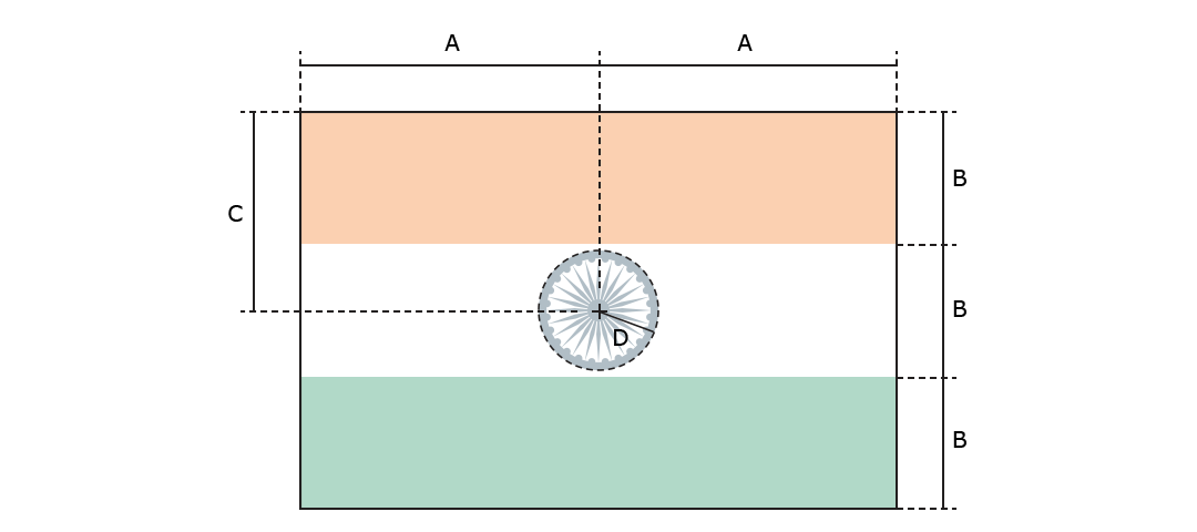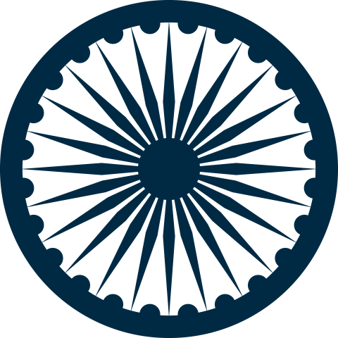 The flag of India three equal horizontal bands of saffron (subdued orange) (top), white, and green with a dark blue chakra (24-spoked wheel) centered in the white band.