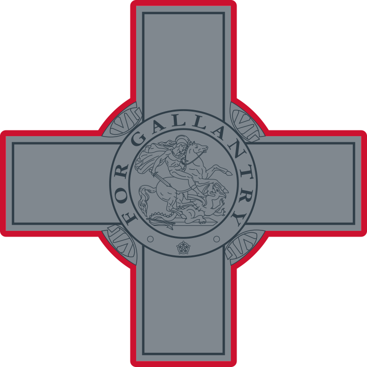Two equal vertical bands of white (hoist side) and red; in the upper hoist-side corner is a representation of the George Cross, edged in red.