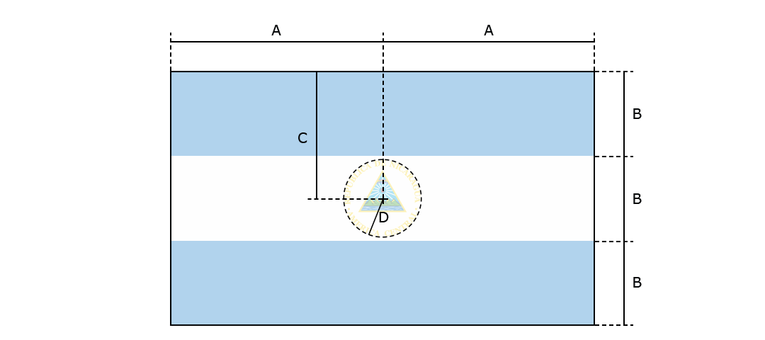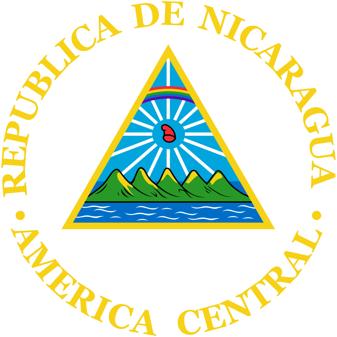 Three equal horizontal bands of blue (top), white, and blue with the national coat of arms centered in the white band; the coat of arms features a triangle encircled by the words REPUBLICA DE NICARAGUA on the top and AMERICA CENTRAL on the bottom.
