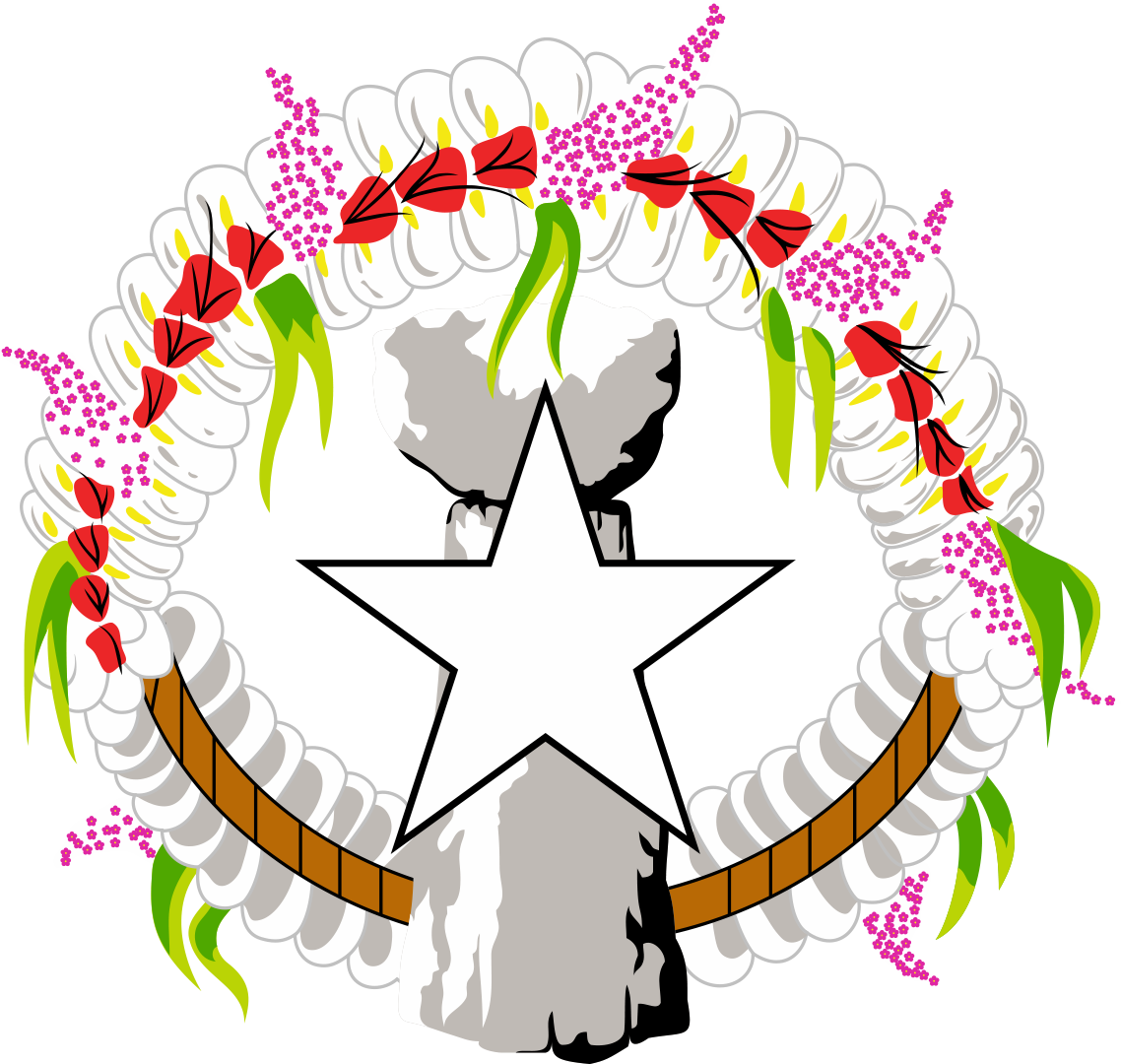 Blue, with a white, five-pointed star superimposed on the gray silhouette of a latte stone (a traditional foundation stone used in building) in the center, surrounded by a wreath.
