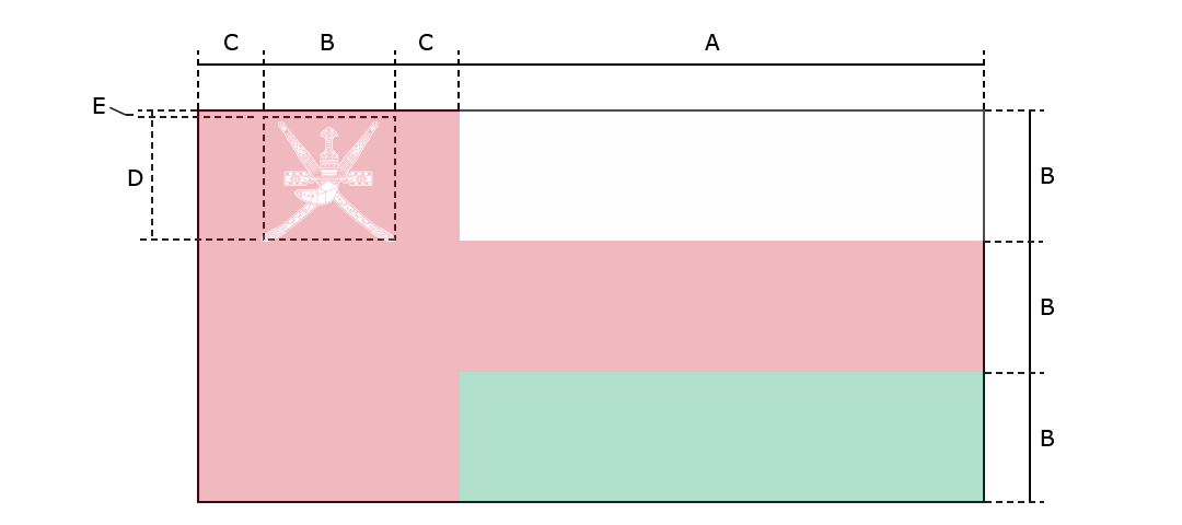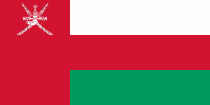 Three horizontal bands of white, red, and green of equal width with a broad, vertical, red band on the hoist side; the national emblem (a khanjar dagger in its sheath superimposed on two crossed swords in scabbards) in white is centered near the top of the vertical band.