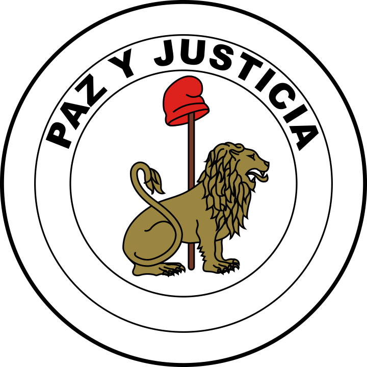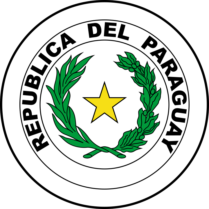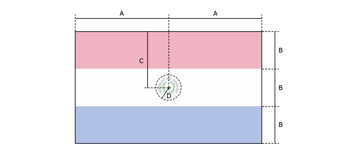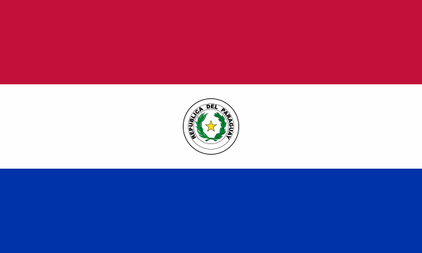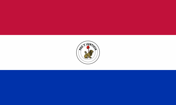 Three equal, horizontal bands of red (top), white, and blue with an emblem centered in the white band; unusual flag in that the emblem is different on each side; the obverse (hoist side at the left) bears the national coat of arms (a yellow five-pointed star within a green wreath capped by the words REPUBLICA DEL PARAGUAY, all within two circles); the reverse (hoist side at the right) bears the seal of the treasury (a brown lion below a red Cap of Liberty and the words Paz y Justicia (Peace and Justice) capped by the words REPUBLICA DEL PARAGUAY, all within two circles).