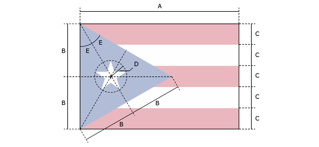 Five equal horizontal bands of red (top and bottom) alternating with white; a blue isosceles triangle based on the hoist side bears a large, white, five-pointed star in the center.