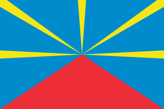 A red triangle at the base of the flag, over a blue field, with golden rays coming from the top of the triangle. The blue represents the sky, the red represents the volcano, and strength, and the golden rays represents the sun