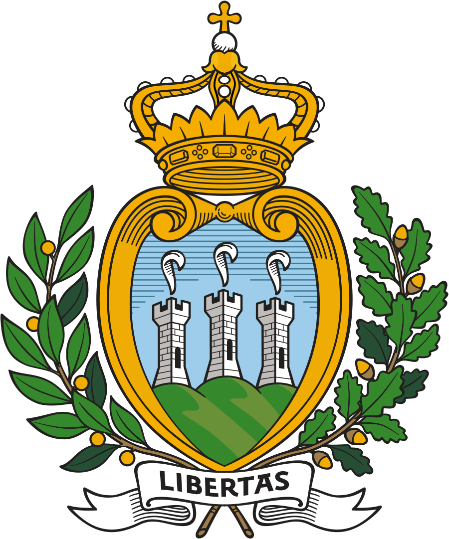 The flag of San Marino two equal horizontal bands of white (top) and light blue with the national coat of arms superimposed in the center; the coat of arms has a shield (featuring three towers on three peaks) flanked by a wreath, below a crown and above a scroll bearing the word LIBERTAS (Liberty).