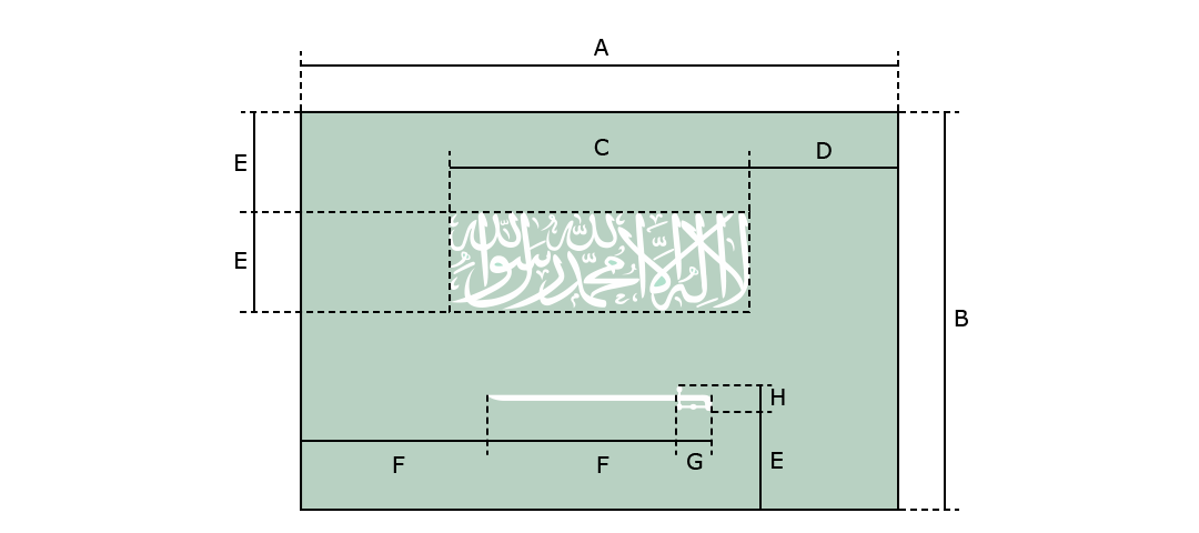 Green, a traditional color in Islamic flags, with the Shahada or Muslim creed in large white Arabic script (translated as "There is no god but God; Muhammad is the Messenger of God") above a white horizontal saber (the tip points to the hoist side.