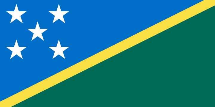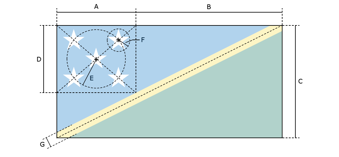 The flag is divided diagonally by a thin yellow stripe from the lower hoist-side corner; the upper triangle (hoist side) is blue with five white five-pointed stars arranged in an X pattern; the lower triangle is green.