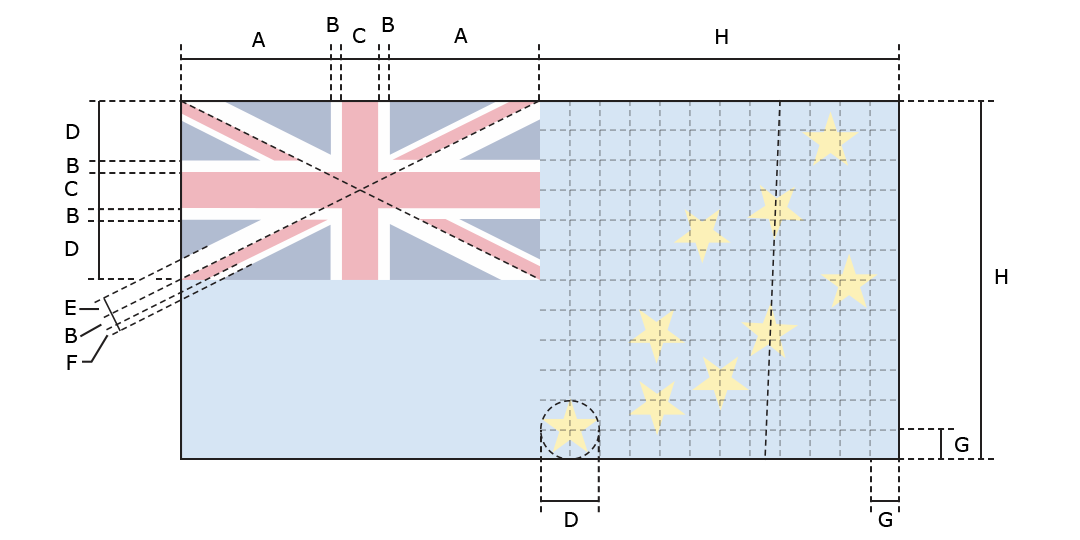 Light blue with the flag of the UK in the upper hoist-side quadrant; the outer half of the flag represents a map of the country with nine yellow five-pointed stars symbolizing the nine islands.