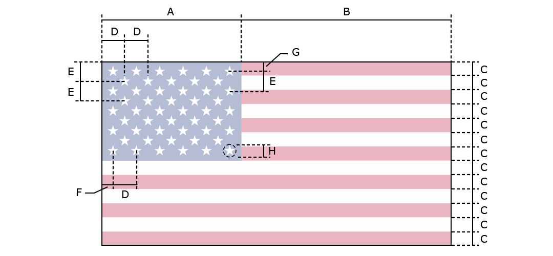 The flag of United States of America 13 equal horizontal stripes of red (top and bottom) alternating with white; there is a blue rectangle in the upper hoist-side corner bearing 50 small, white, five-pointed stars arranged in nine offset horizontal rows of six stars (top and bottom) alternating with rows of five stars; the 50 stars represent the 50 states, the 13 stripes represent the 13 original colonies.