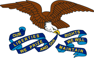 Having three vertical stripes blue, white and red the Iowa flag resembles the flag of France. On the white stripe is a bald eagle carrying a blue streamer in its beak. The state motto " Our Liberties We Prize, and Our Rights We will Maintain" is written on the streamer. The name of the state is emblazoned in red letters.