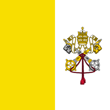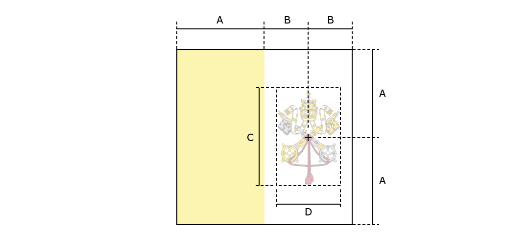 Two vertical bands of yellow (hoist side) and white with the arms of the Holy See, consisting of the crossed keys of Saint Peter surmounted by the three-tiered papal tiara, centered in the white band.