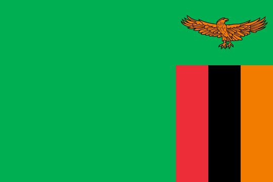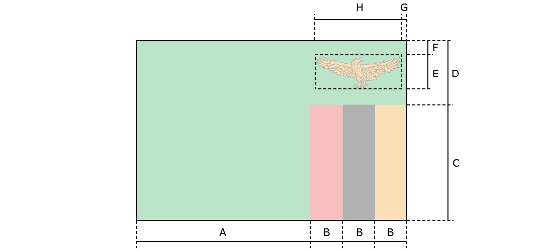 Green with a panel of three vertical bands of red (hoist side), black, and orange below a soaring orange eagle, on the outer edge of the flag.